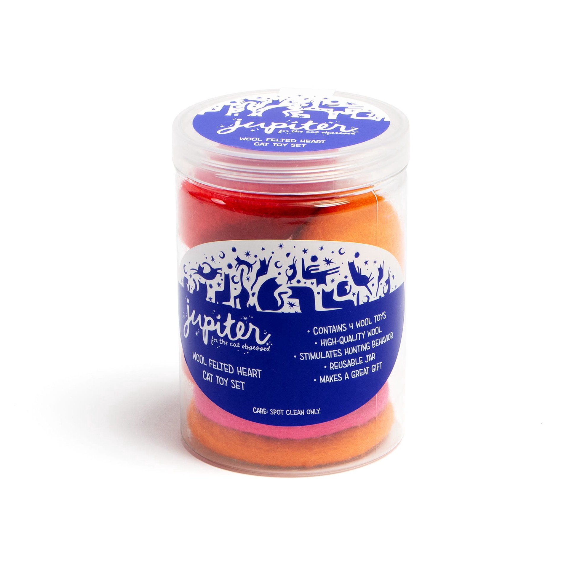 Introduce a touch of softness to your cat's playtime with Jupiter's Heart-felt Cat Toy Set. This pack comes in a reusable screw-top plastic jar filled with five delicately crafted wool-felted cat toys…