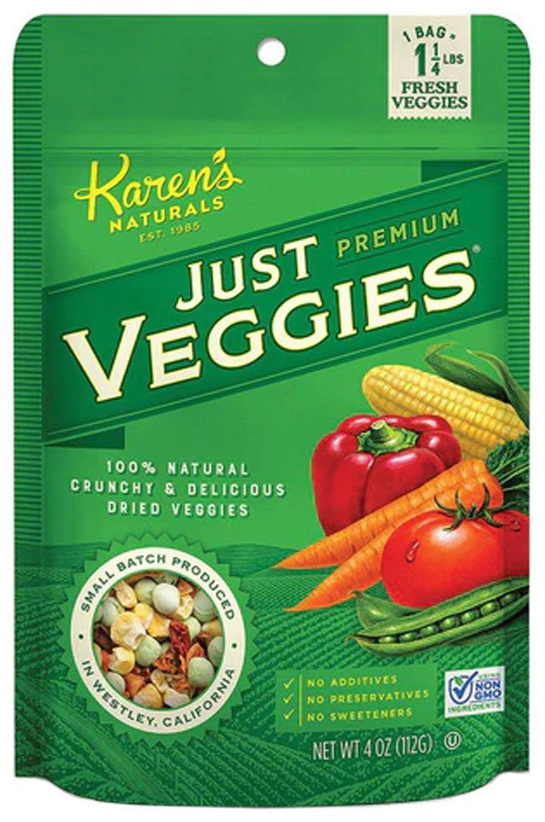 Freeze-Dried Corn and Peas, Air-Dried Carrots and Bell Peppers, Dehydrated Tomatoes.