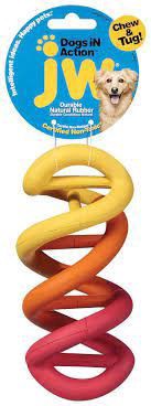 A JW Dogs in Action Rubber Dog Toy is a fun interactive toy satisfying a dog's natural need to chew and exercise its teeth and jaws. This dog toy features a fun double-helix shape similar to a real mo…