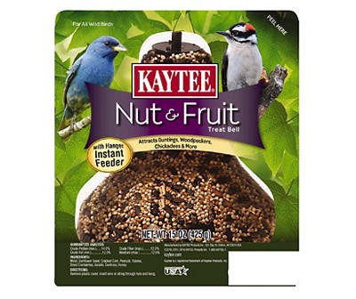 Kaytee Nut & Fruit Treat Bell attracts woodpeckers, chickadees, buntings and more! Kaytee Treat Bells are convenient, ready-to-hang, instant feeders made with only the finest ingredients.