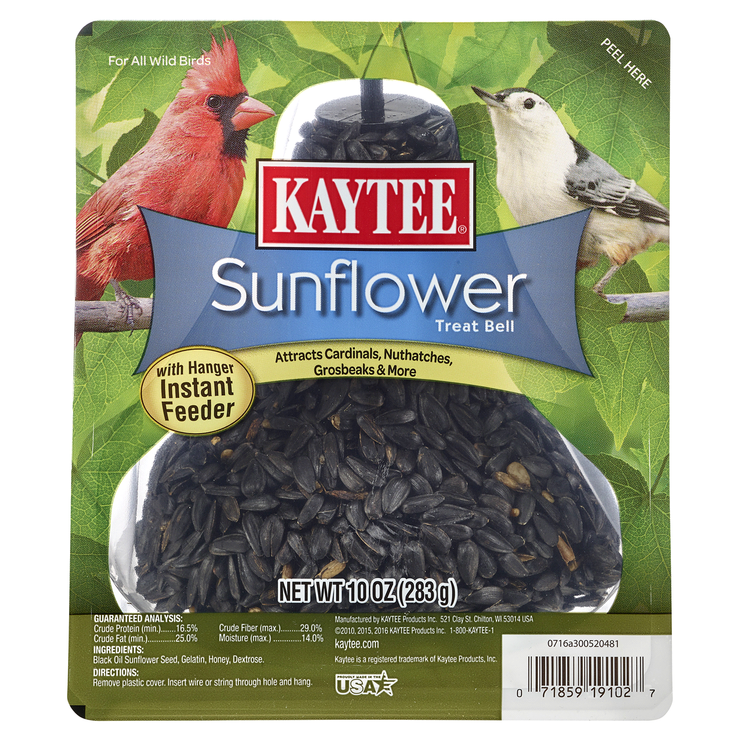 Kaytee Sunflower Treat Bell is a favorite among many wild birds! Treat bells are convenient, ready-to-hang instant feeders and are made with only the finest ingredients.