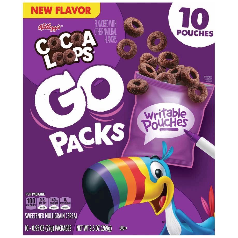 Keep your day going on the right foot with Kellogg's Cocoa Loops Go Packs filled with chocolatey flavor in convenient writeable pouchesCrispy cereal pieces made with cocoa help bring smiles to busy da…