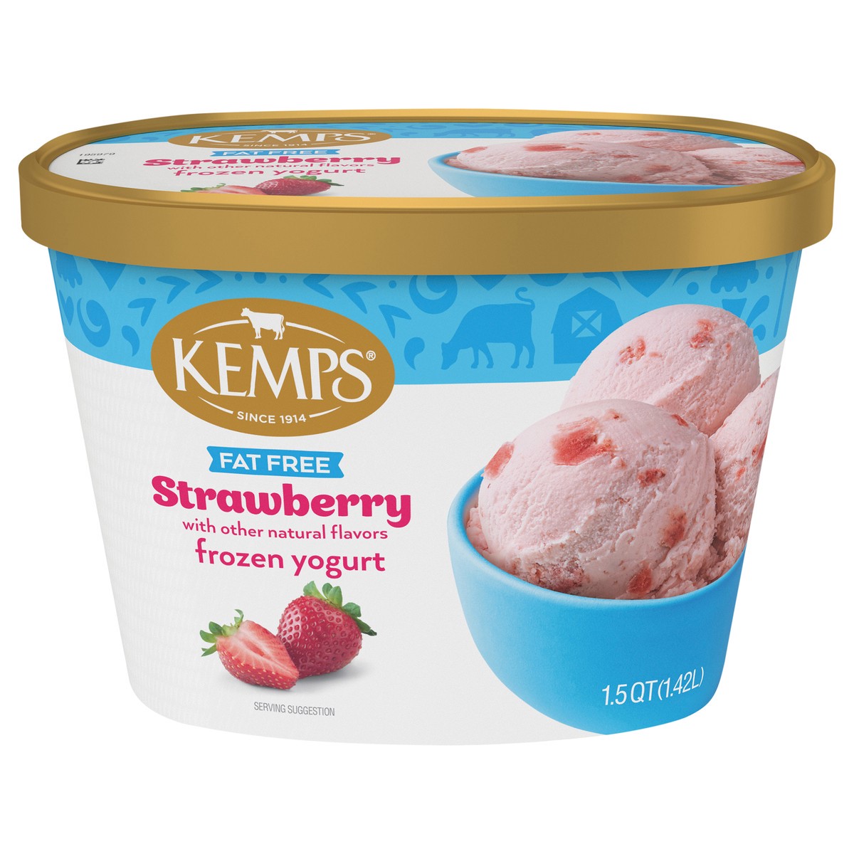 Made with real milk & strawberries. Fat free strawberry with other natural flavors. 110 calories per serving. About 4 servings per package. Since 1419. Real. www.kemps.com. Questions or Comments: 1-80…