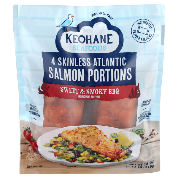 slide 1 of 1, Keohane Seafood Skinless Sweet & Smoky BBQ Marinade Salmon Portions, 18 oz