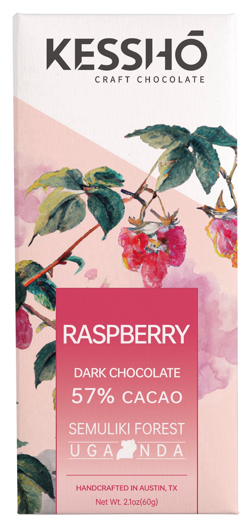 Indulge yourself with Kessho's fruit-forward dark bean-to-bar chocolate. Made with cacao beans sourced from Simuliki Forest in Uganda and fortified by powdered raspberries, this sweet and tangy deligh…