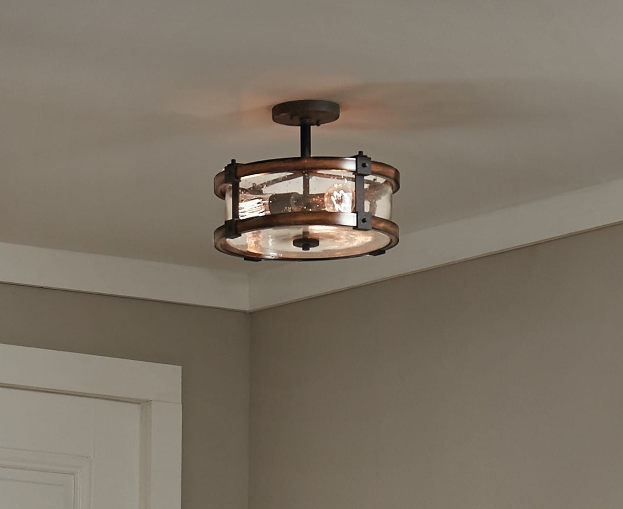 Distressed black and wood tone finish semi-flush mount light from the Barrington collection has an industrial feel. Clear seeded glass shade offers an effervescent, old-fashioned style. Requires three…