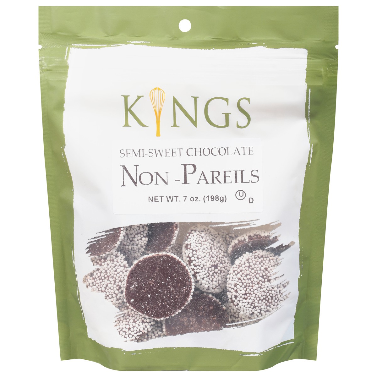 Semi-Sweet Chocolate (Unsweetened Chocolate, Sugar, Cocoa Butter), Soya Lecithin and Pure Vanilla. Nonpareils Contain Sugar, Cornstarch, Carnauba Wax.