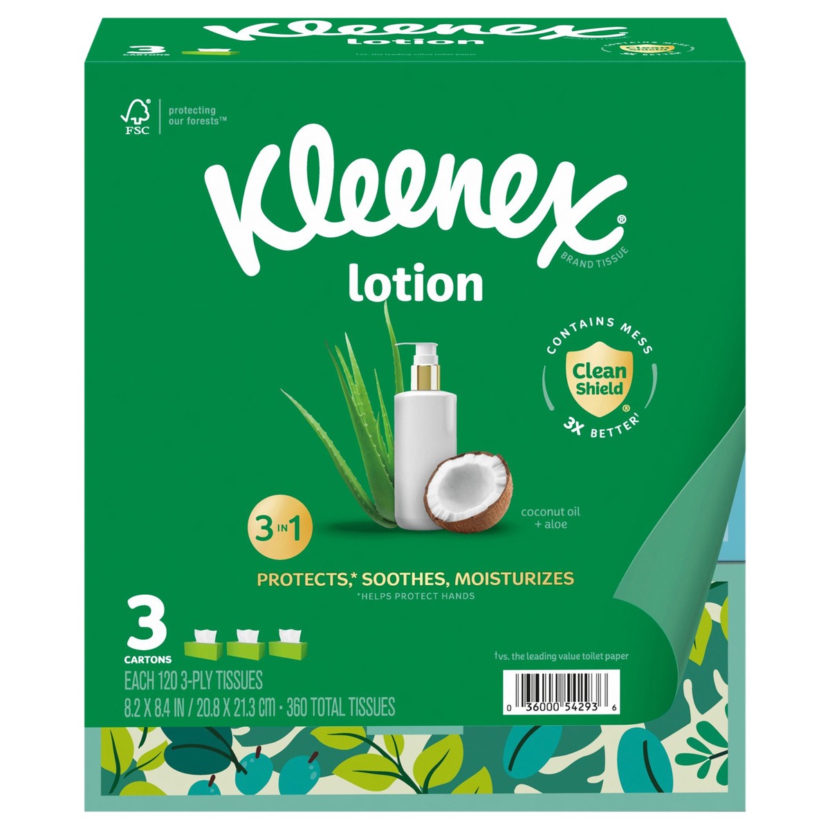 3 flat boxes of Kleenex Soothing Lotion Facial Tissues with Coconut Oil, Aloe & Vitamin E, each box containing 120 tissues - packaging may vary from what is shown. The #1 preferred lotion tissue (vs l…