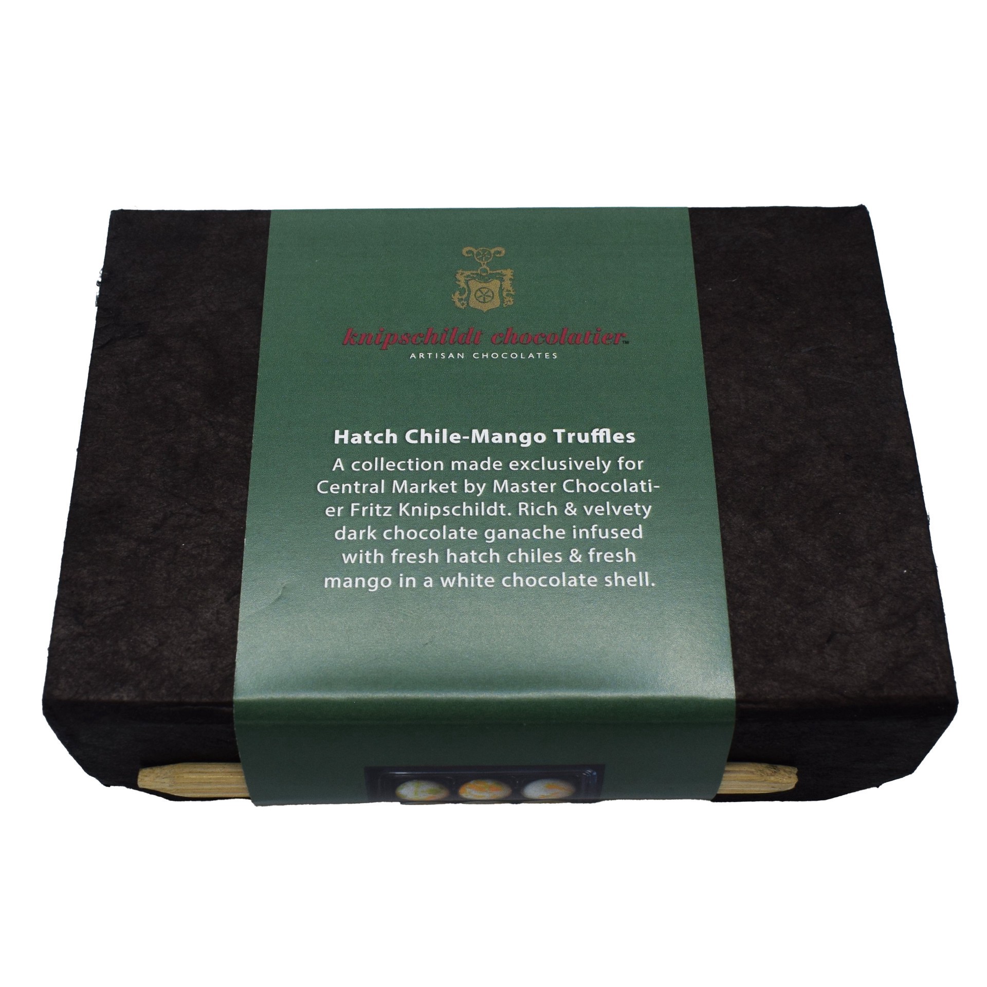 A collection made exclusively for Central Market by Master Chocolatier Fritz Knipschildt. Rich & velvety dark chocolate ganache infused with fresh hatch chiles & fresh mango in a white chocolate shell…