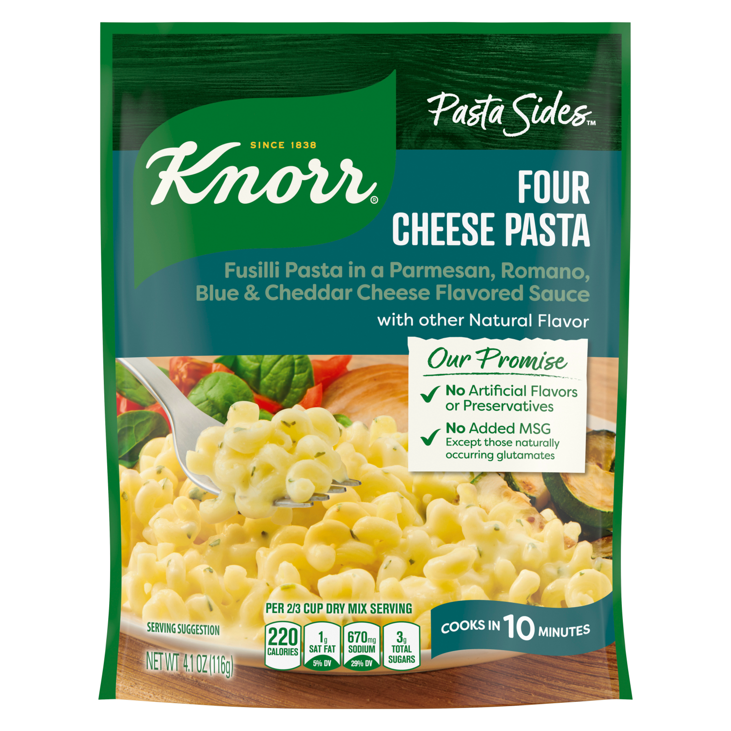 Treat your taste buds to Knorr Pasta Sides Four Cheese Pasta. Our pasta side Four Cheese Pasta expertly combines tender fusilli with a Parmesan, Romano, Blue, and Cheddar cheese-flavored sauce. In add…