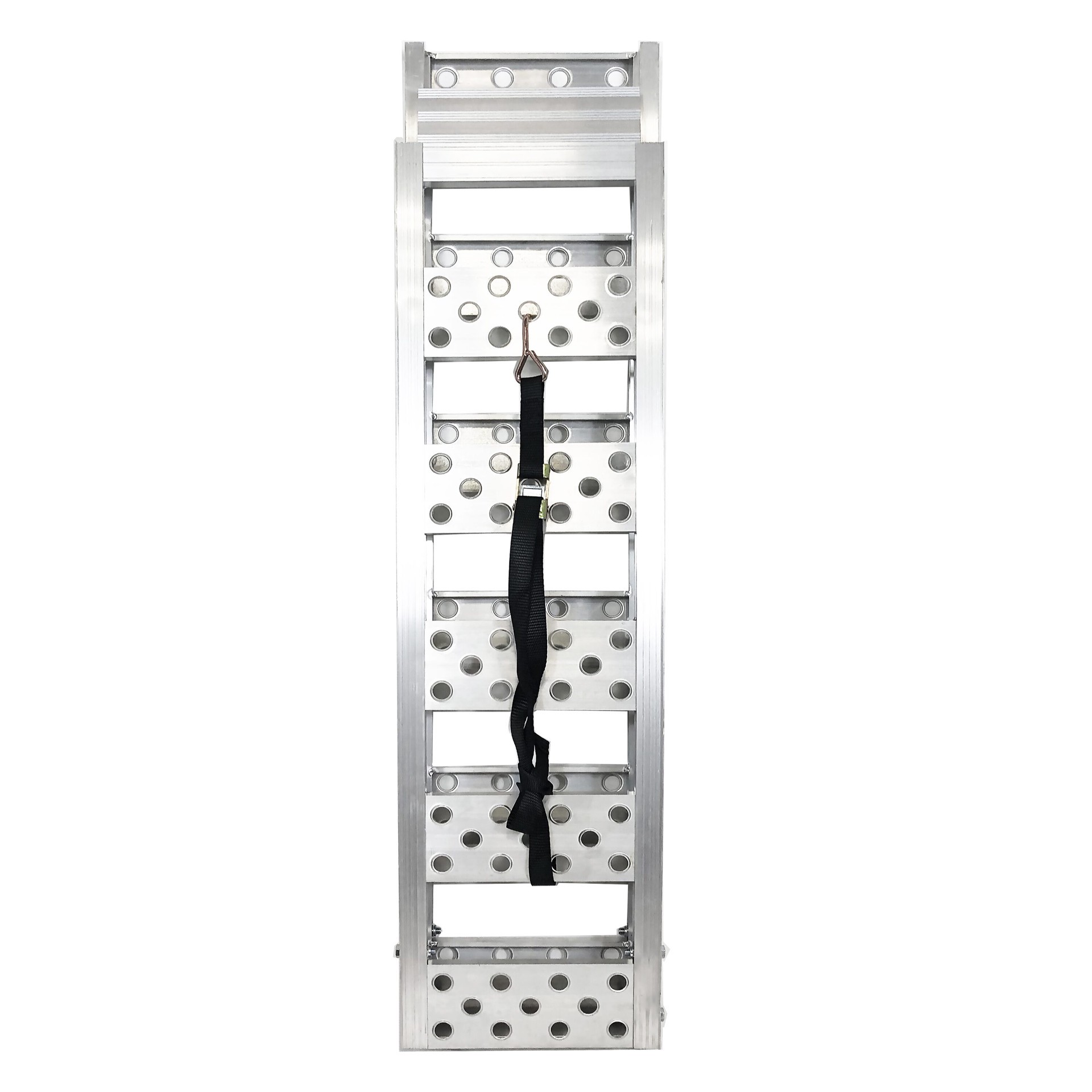 Center folding design of the arched ramp allows for easy storage. Dimensions(open): 11 in x 90 in, dimensions(fold): 11 in x 47 in. Capacity:1500-lb per pair (750-lb per ramp). Full width top plate fo…
