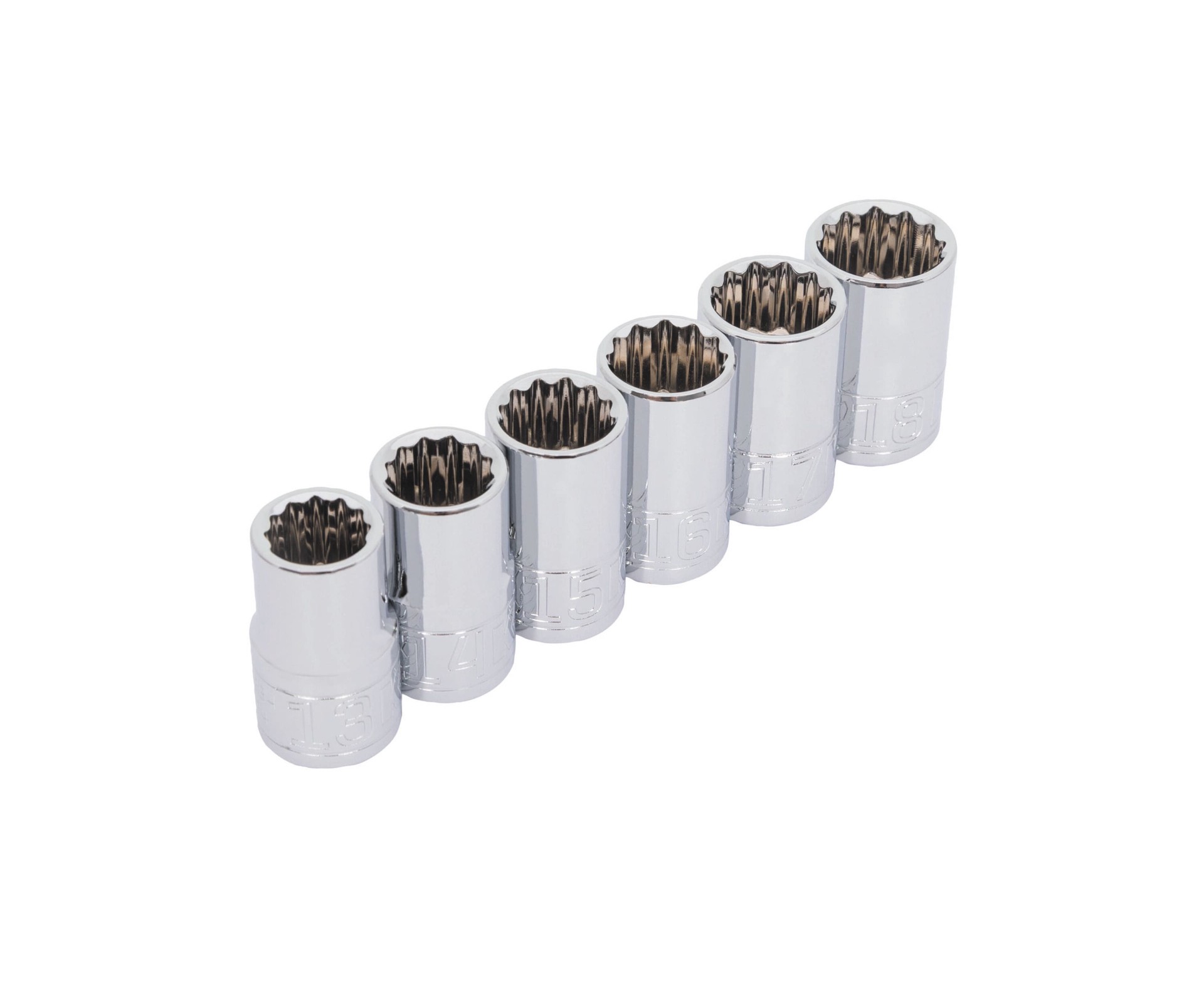 6-Piece Metric 1/2-in drive shallow, 12-point socket set includes 13, 14, 15, 16, 17 and 18mm. Size callouts are hard-stamped for long-lasting identification. Constructed of chrome vanadium steel and …