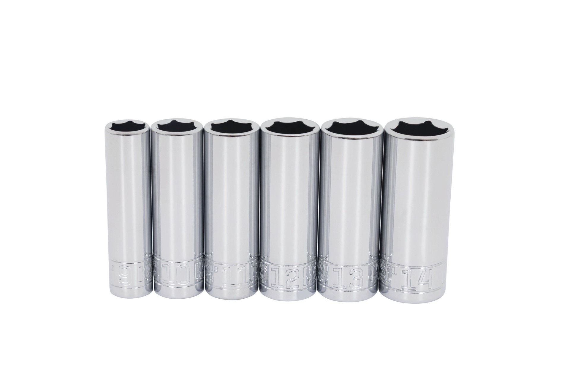 6-Piece Metric 1/4-in drive deep, 6-point socket set includes 9, 10, 11, 12, 13 and 14mm. Size callouts are hard-stamped for long-lasting identification. Constructed of chrome vanadium steel and heat-…