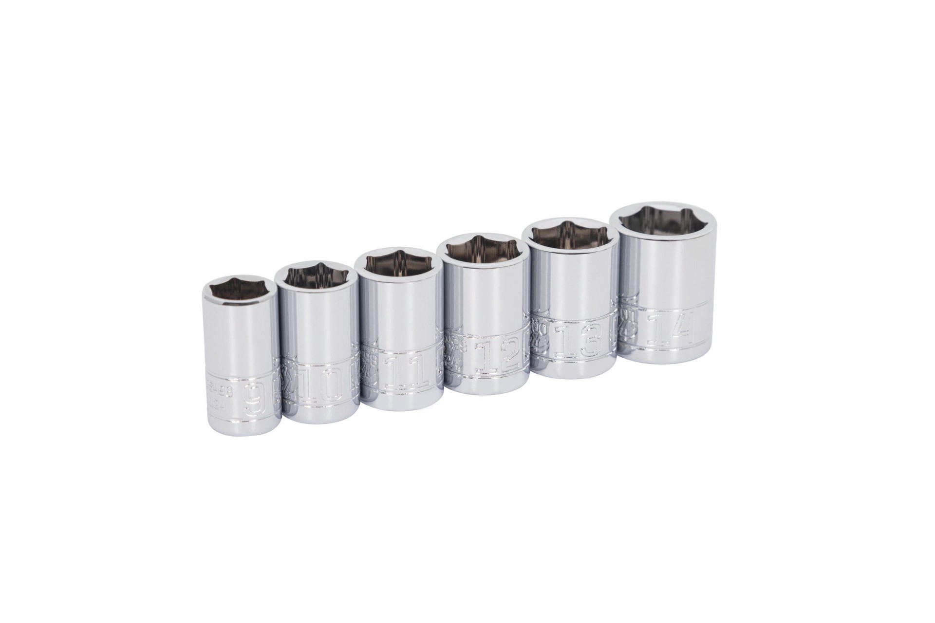 6-Piece Metric 1/4-in drive shallow, 6-point socket set includes 9, 10, 11, 12, 13 and 14mm. Size callouts are hard-stamped for long-lasting identification. Constructed of chrome vanadium steel and he…
