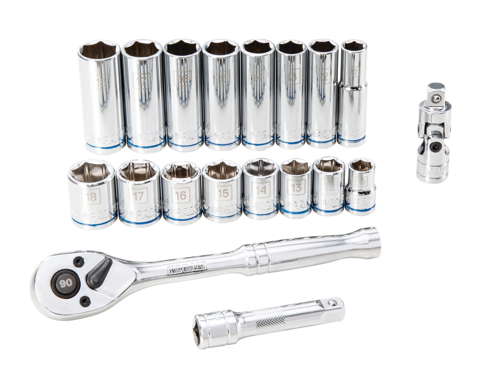 This 3/8-inch drive set contains 16 commonly used shallow and deep metric sockets, a ratchet, a 3-inch extension and one 3/8x3/8-inch universal joint extension. 90-Tooth ratcheting mechanism provides …