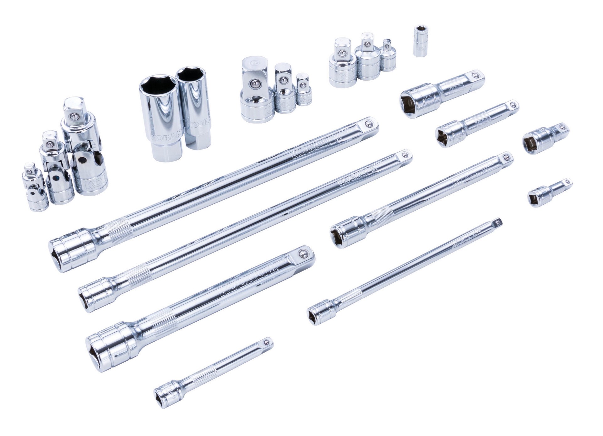 This assorted drive accessory set provides a great selection of extensions and adapters, no matter what drive size you are using. 1/4-Inch drive accessories include a 1-1/2-in, 3-in and 6-in extension…