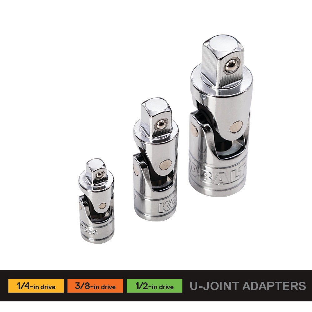 This universal joint adapter set includes 1/4-in, 3/8-in and 1/2-in drive adapters. Helps get to hard-to-reach fasteners. Constructed of chrome vanadium steel and heat treated for strength and durabil…