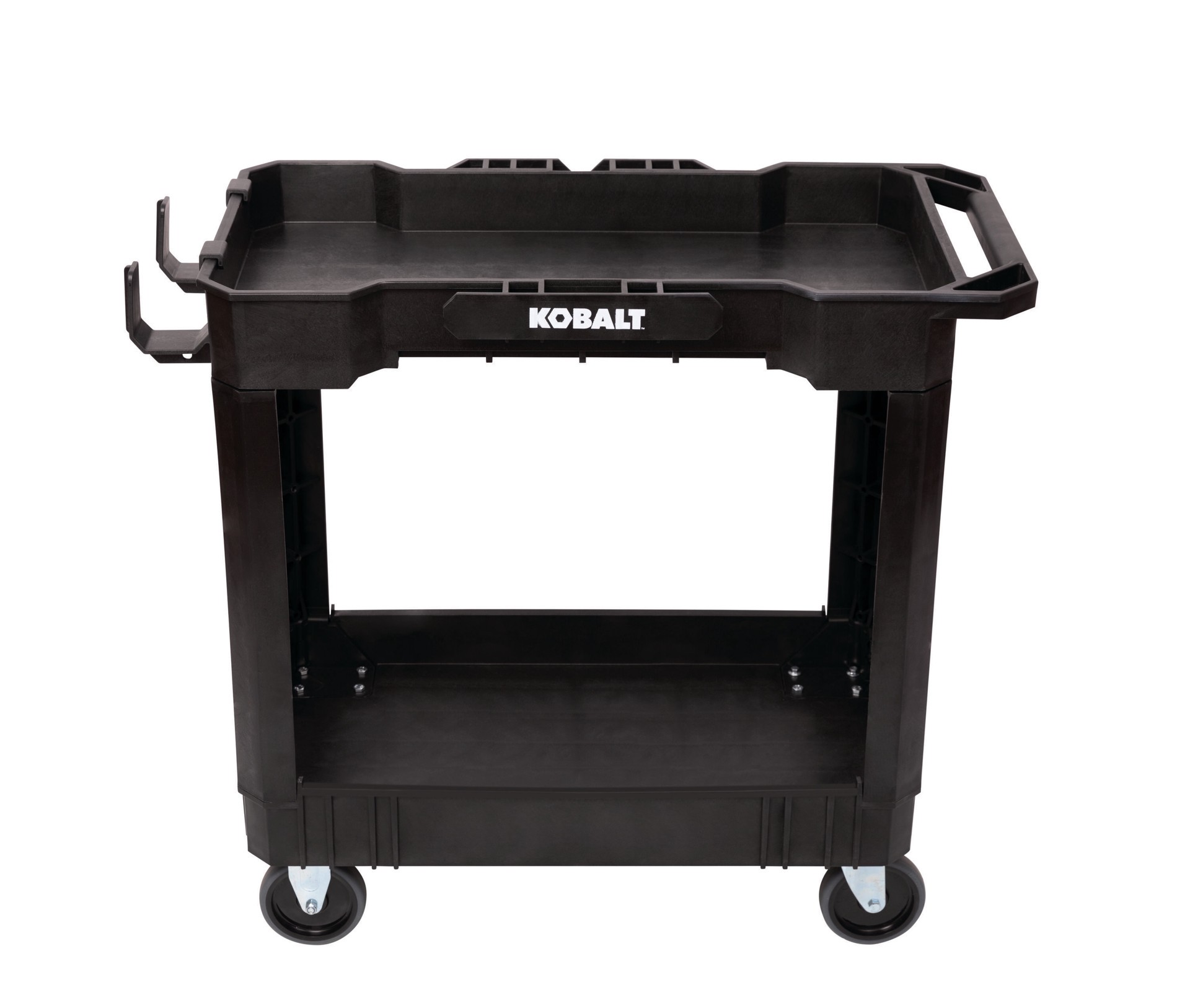 Kobalt's rolling utility cart measures 32.5 in H x 34 in W x 17 in D. Heavy-duty structural foam construction provides a total load capacity up to 500 pounds (250 pounds per shelf). Complete with buil…