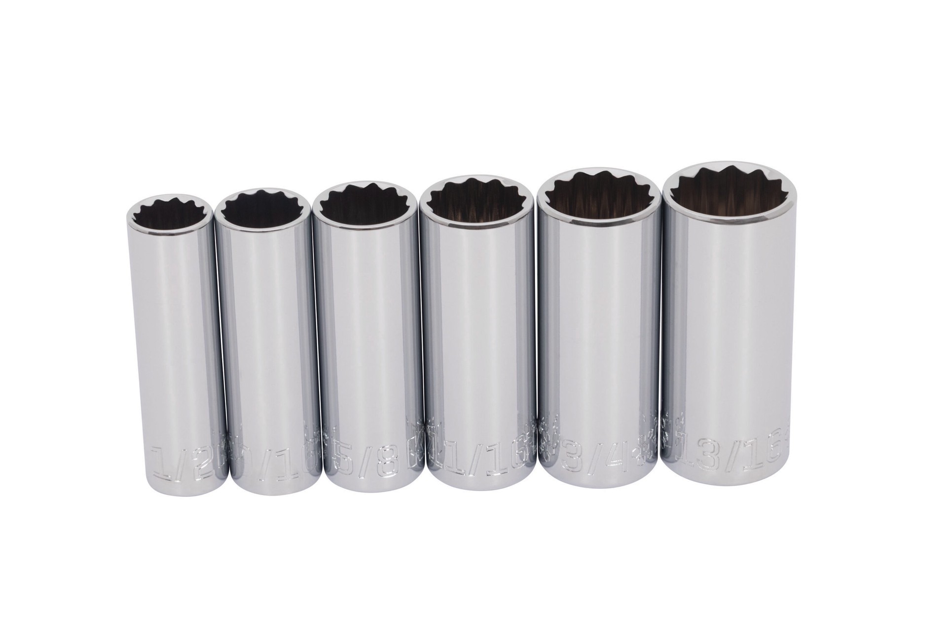 6-Piece Standard (SAE) 3/8-in drive deep, 12-point socket set includes 1/2, 9/16, 5/8, 11/16, 3/4 and 13/16in. Size callouts are hard-stamped for long-lasting identification. Constructed of chrome van…