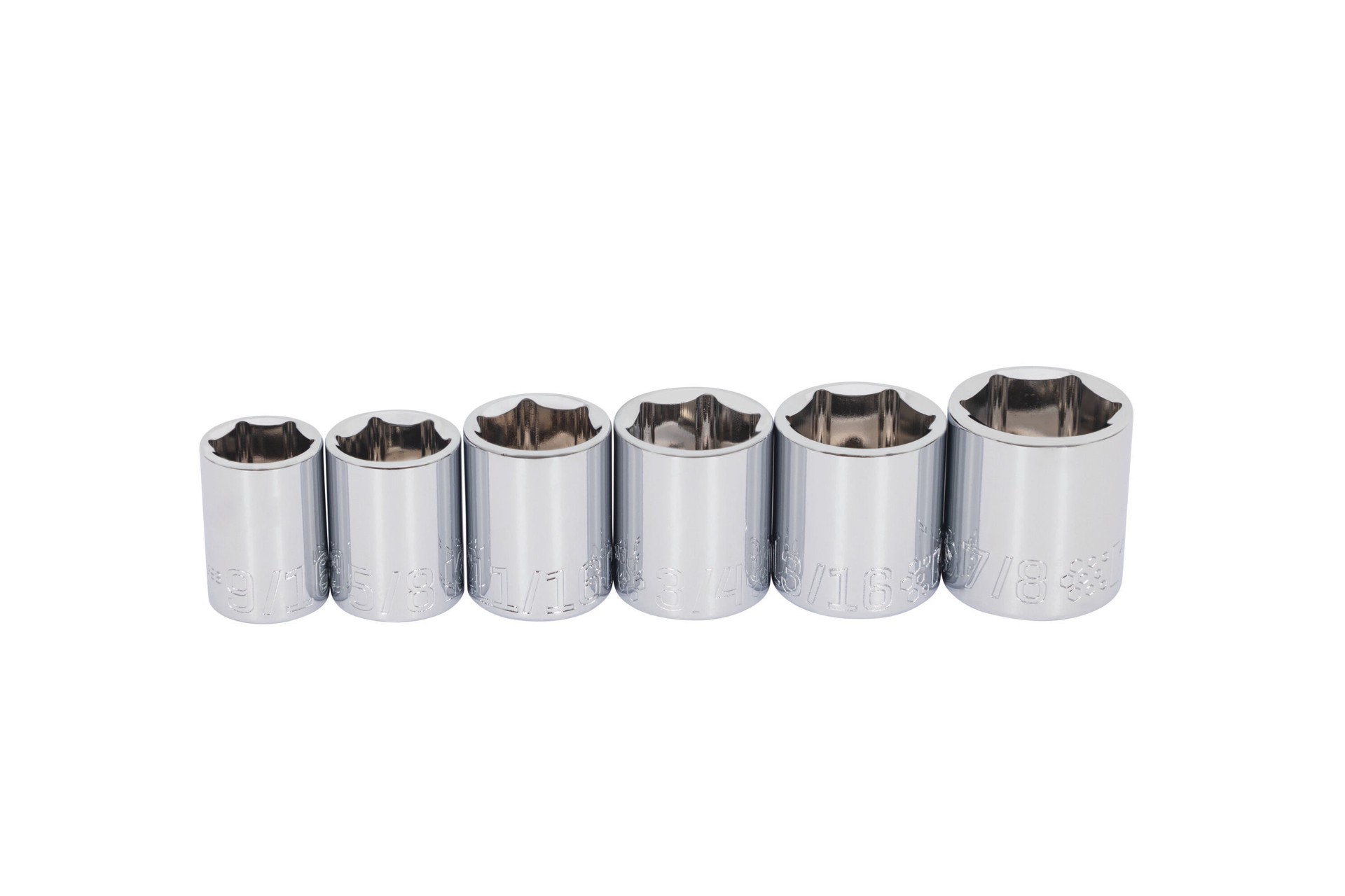 6-Piece Standard (SAE) 3/8-in drive shallow, 6-point socket set includes 9/16, 5/8, 11/16, 3/4, 13/16 and 7/8in. Size callouts are hard-stamped for long-lasting identification. Constructed of chrome v…