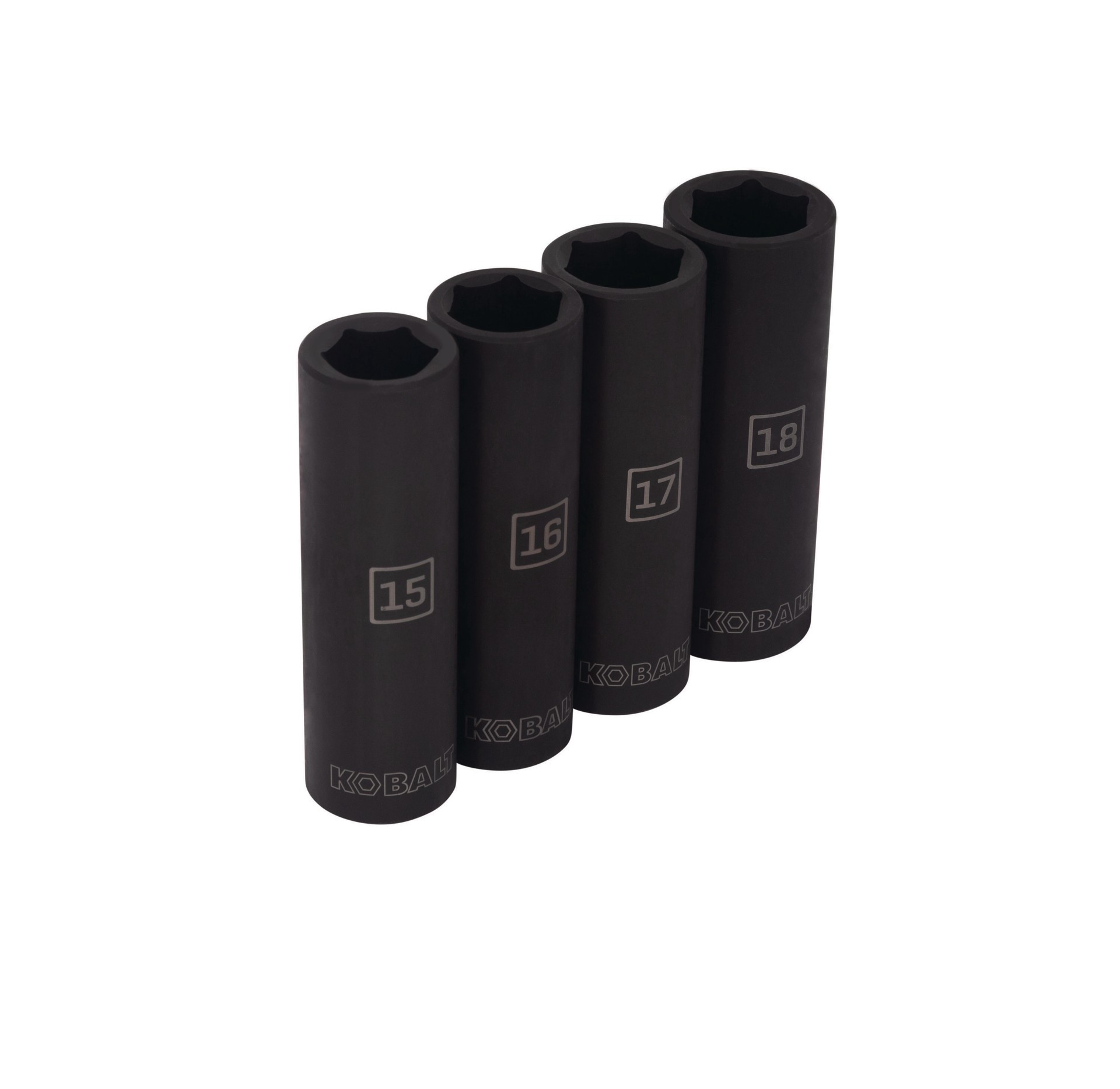 4-Piece Metric 1/2-in drive deep, 6-point impact socket set includes 15, 16, 17 and 18mm. This set is intended for use with an impact tool to provide maximum installation of heavy-duty fasteners. Cons…