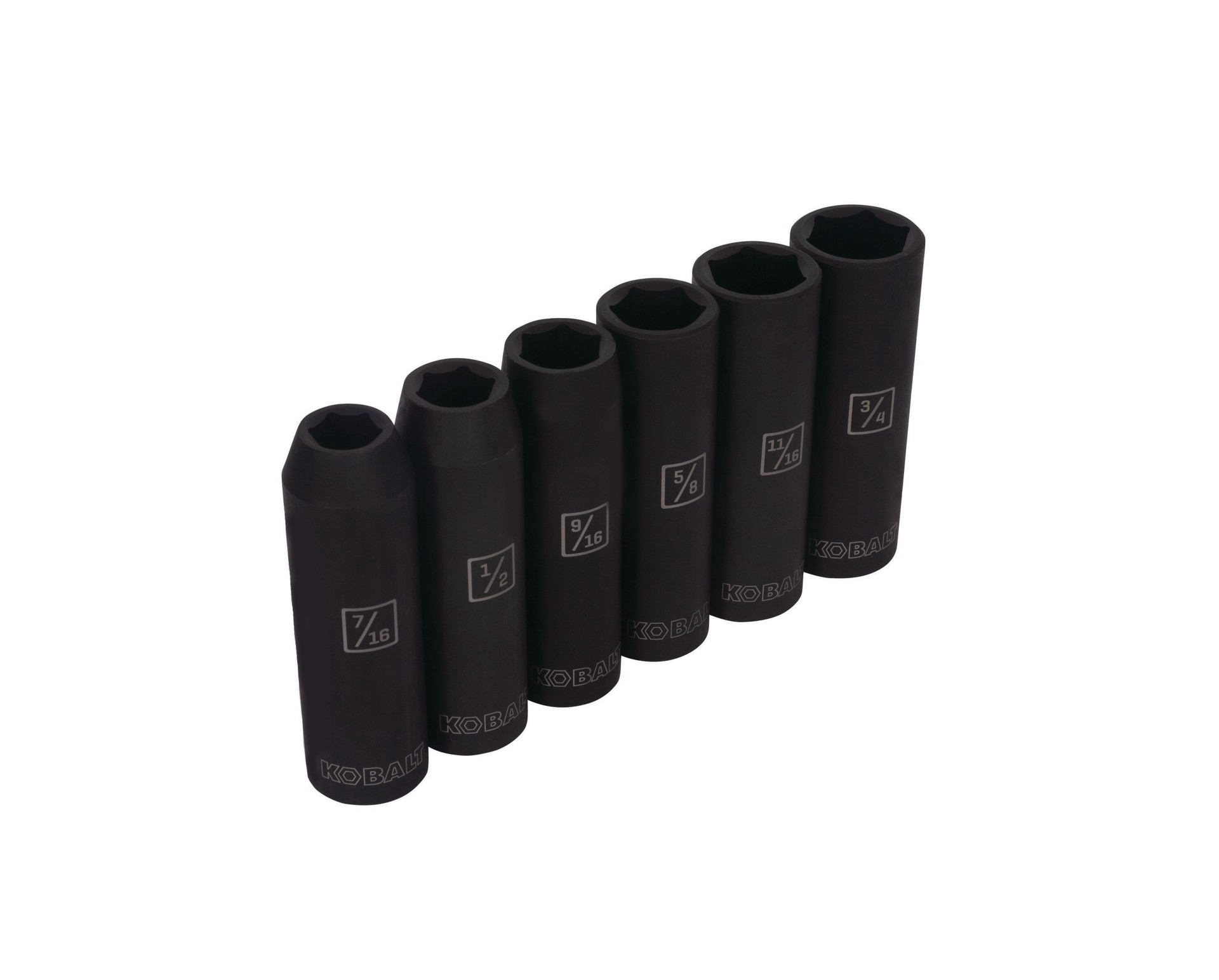 6-Piece Standard (SAE) 1/2-in drive deep, 6-point impact socket set includes 7/16, 1/2, 9/16, 5/8, 11/16 and 3/4in. This set is intended for use with an impact tool to provide maximum installation of …