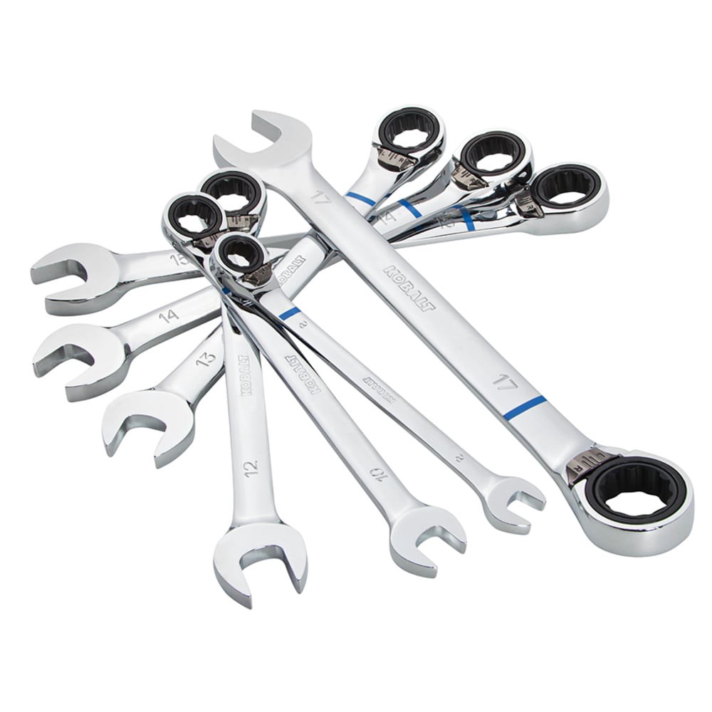 Set includes 8, 10, 12, 13, 14, 15, and 17 mm ratcheting wrenches. Reverse switch allows convenient directional changes without removing the wrench from fastener. 90-Tooth ratcheting box end provides …