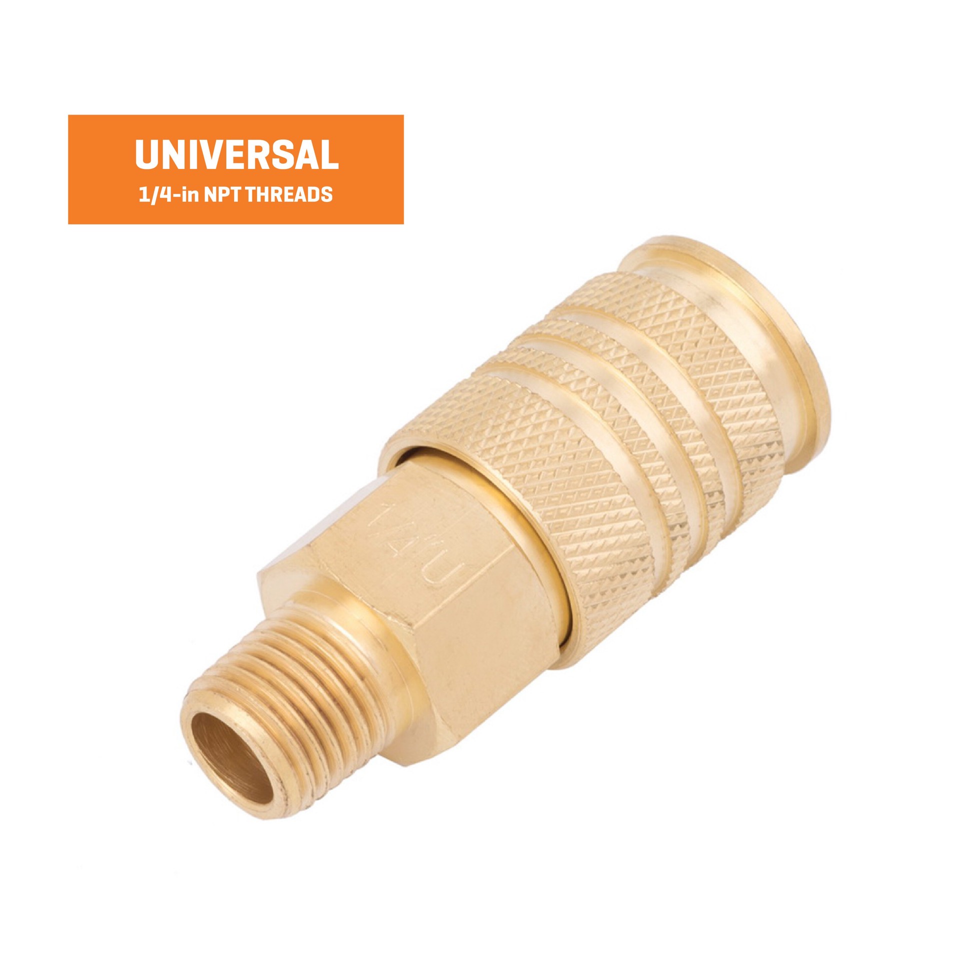 Solid brass construction. Universal coupler connects to industrial or automotive plugs. 1/4-in male NPT threads for connection to air hoses or air tools. Female version, search item #128963.