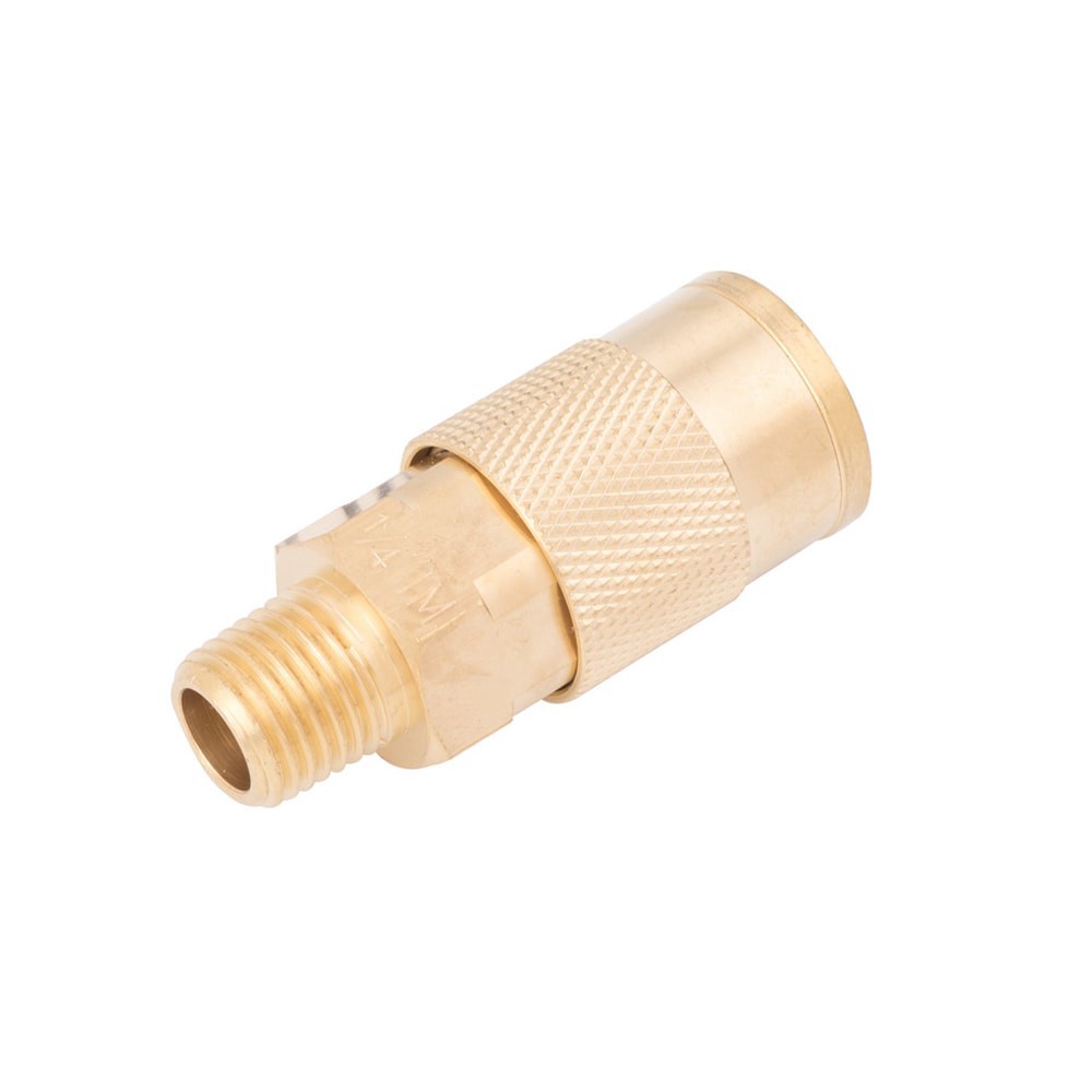 Solid brass construction. Industrial interchange coupler. 1/4-in male NPT threads for connection to air hoses or air tools. Female version, search item #68688.