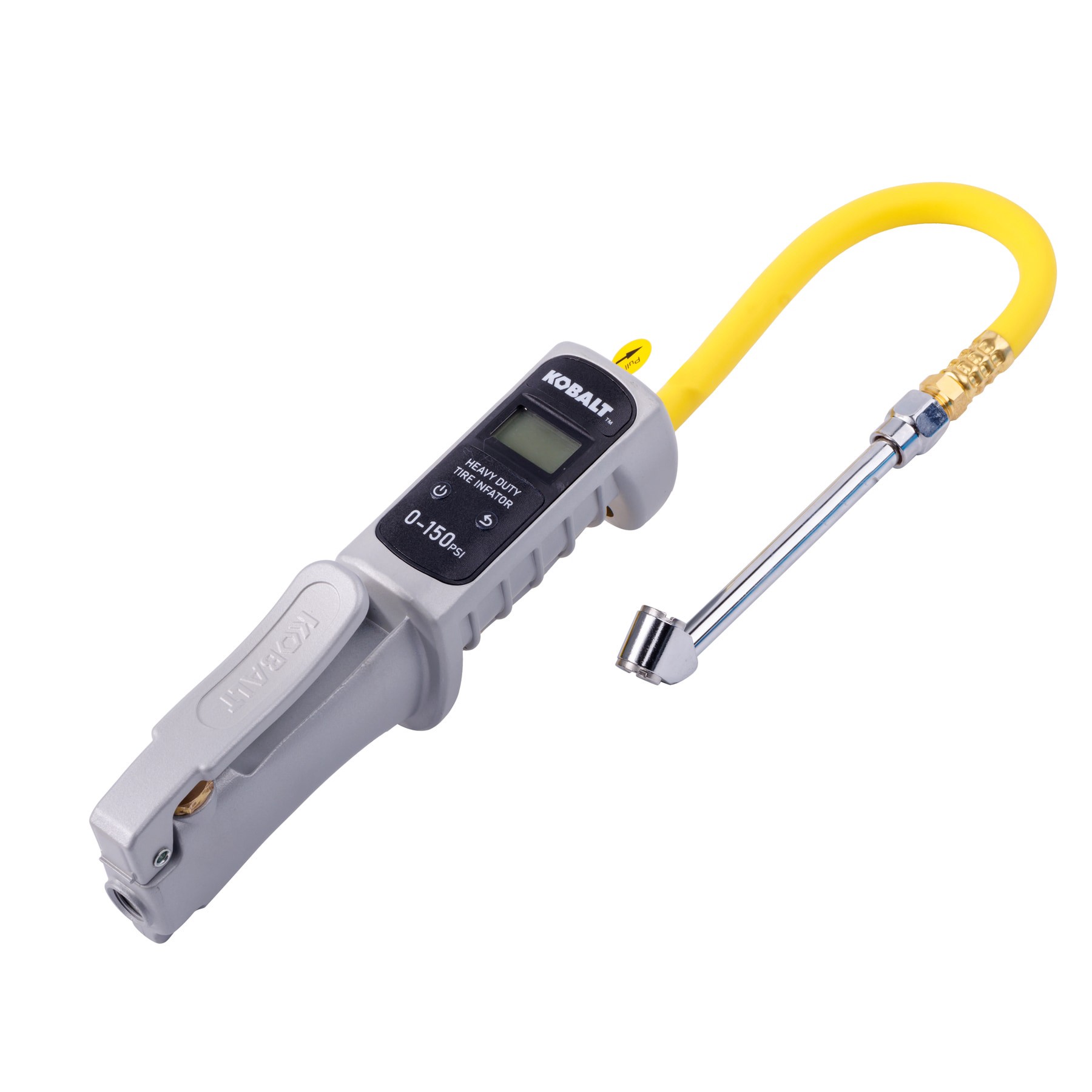 Pressure Range: 0-150 PSI. Hybrid air hose with 360° swivel and dual foot chuck. Large backlit screen with battery indicator powered by 2-AAA batteries (included). Auto on/off feature - turns on when …