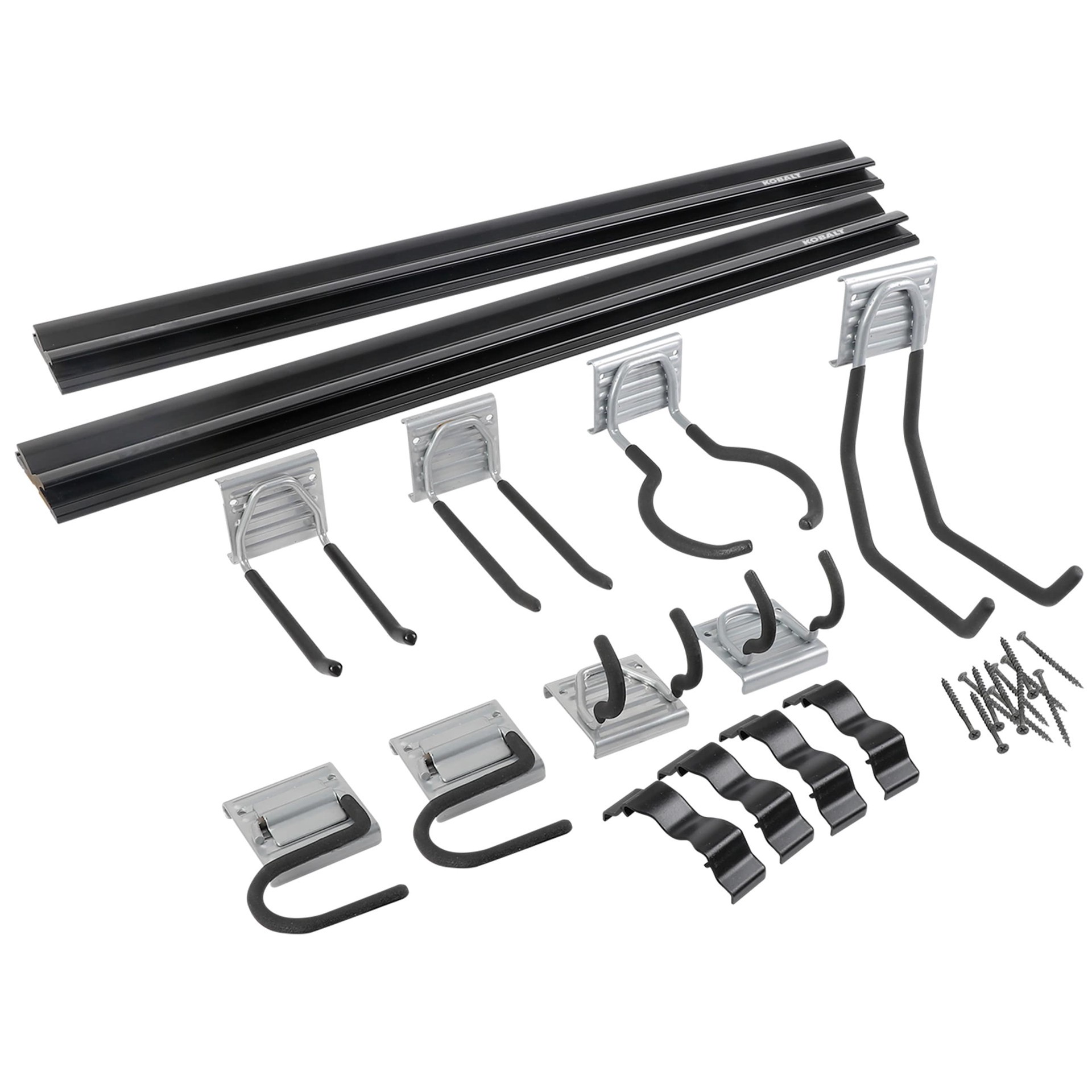 Includes 2 K-rails, 2 forks, 2 S locks, 2 double hooks,1 large heavy duty fork, 1 power tool holder, 4 end cap and 12 pieces screws. Easy to hang and reposition on K-rail wall systems. All installatio…
