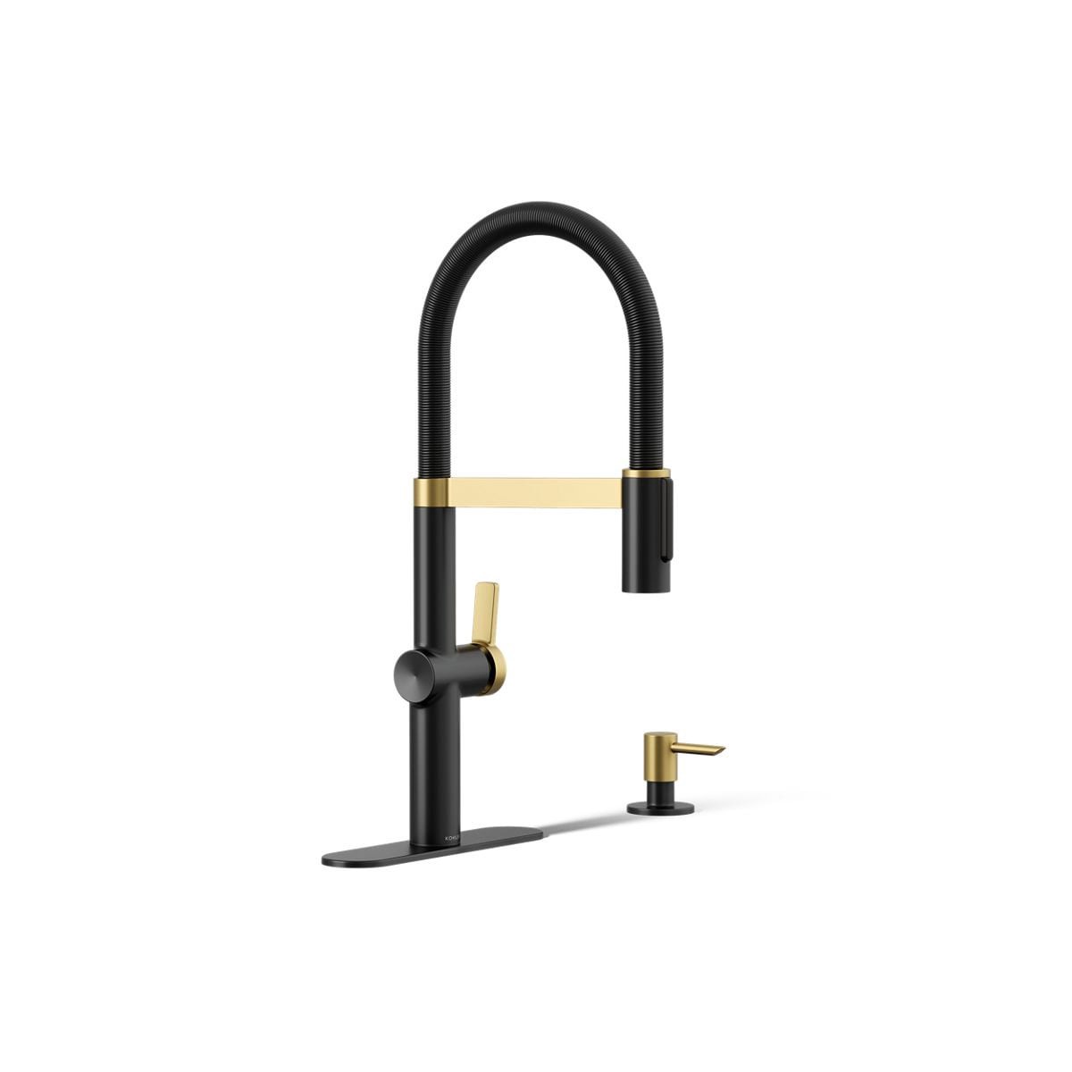 KOHLER Koi Pre-Rinse Spring Matte Black w/Moderne Brass Single Handle Deck-mount Pull-down Kitchen Faucet with Sprayer (Includes Deck Plate) (Includes Soap Dispenser)