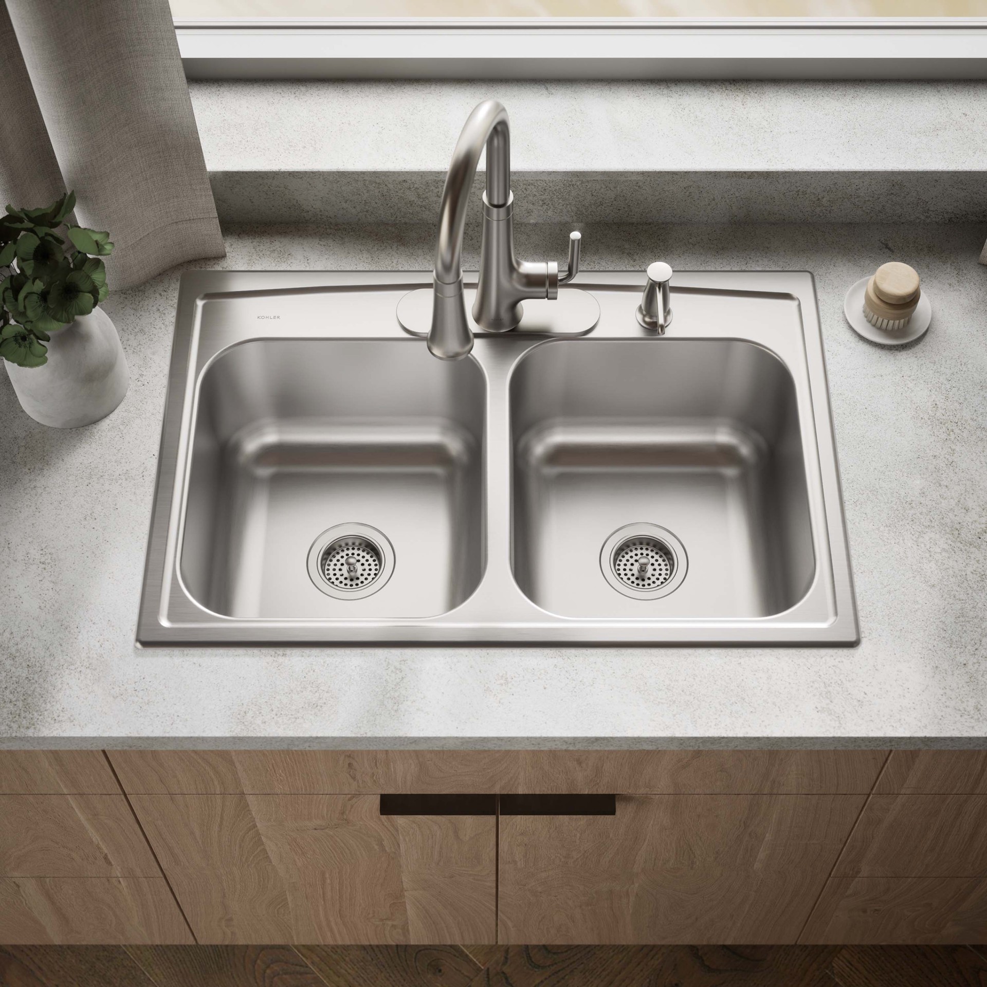 36-In minimum base cabinet width. Double-equal bowls. 9-In (229 mm) depth provides generous workspace. Three faucet holes with one accessory hole to the right. SilentShield® sound-absorption technolog…