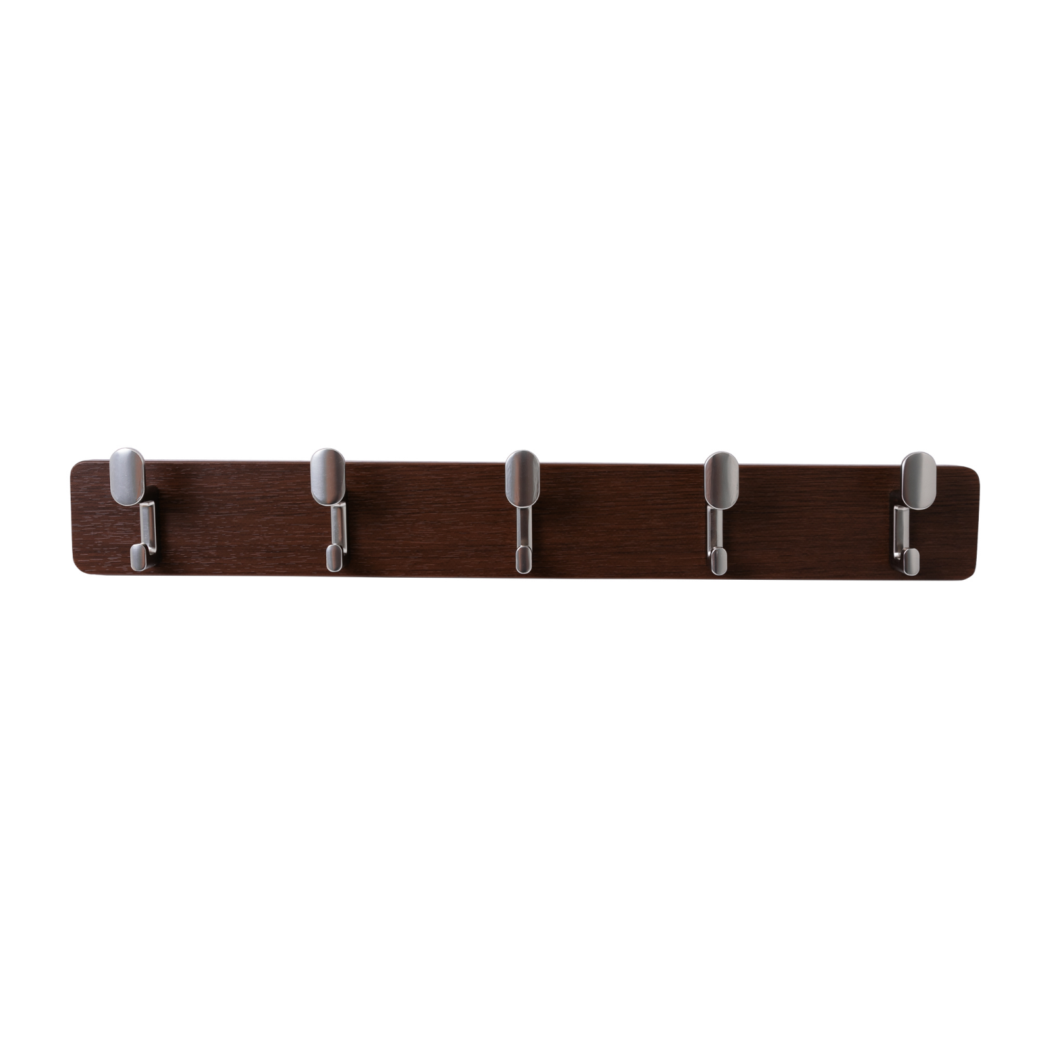 Wall-mounted hook rail with 5 dual hooks for increased storage capacity.