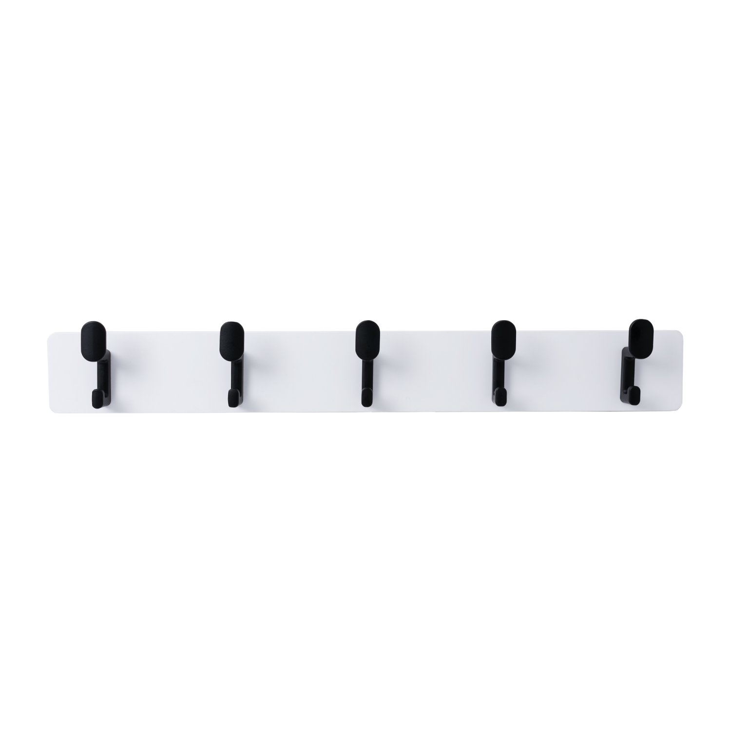 Wall-mounted hook rail with 5 dual hooks for increased storage capacity.