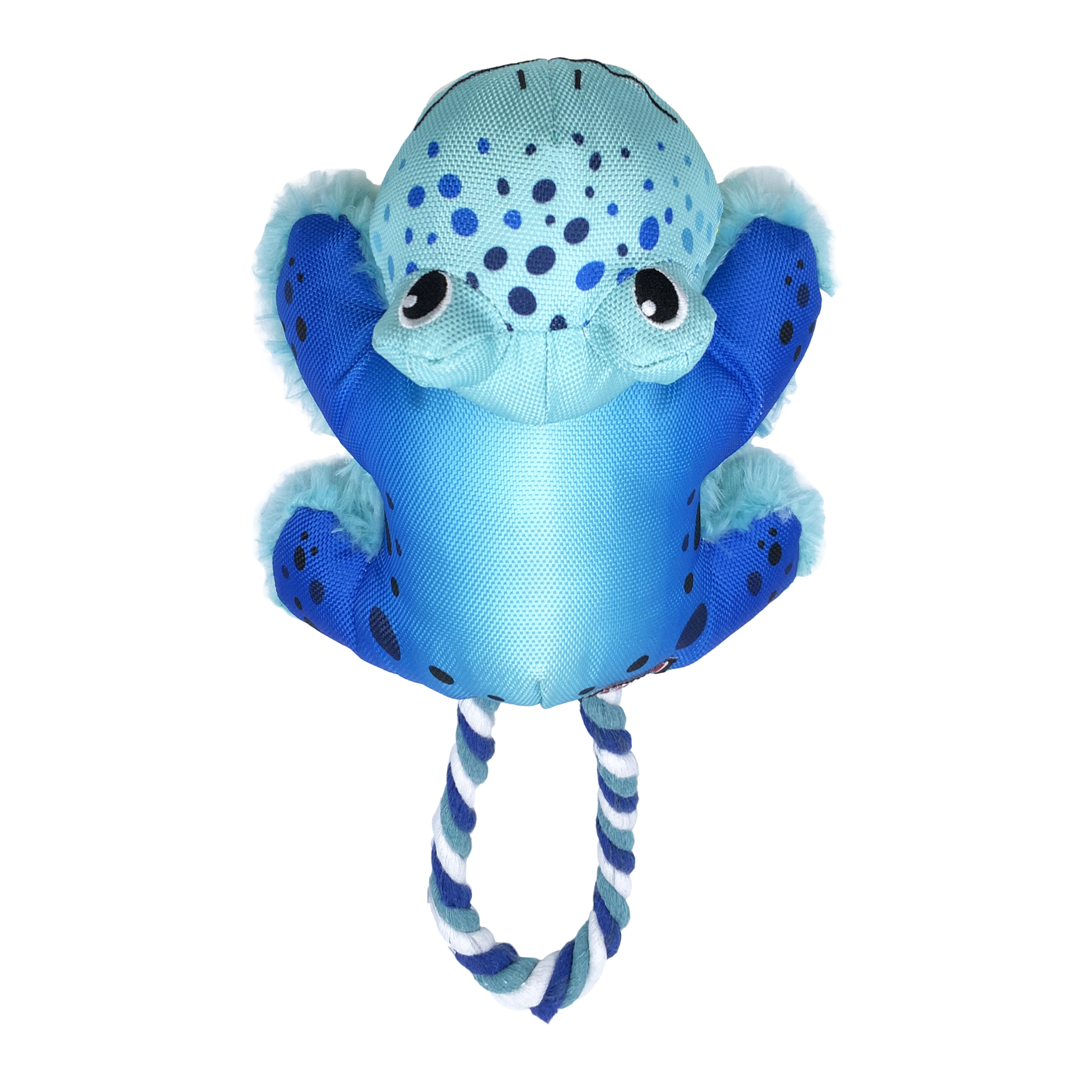 Cozie Tuggz Frog''s rope handle is made from sturdy cotton rope knotted inside his body for instinct-satisfying tugging action. He squeaks and crinkles to keep the fun going for lots of healthy intera…