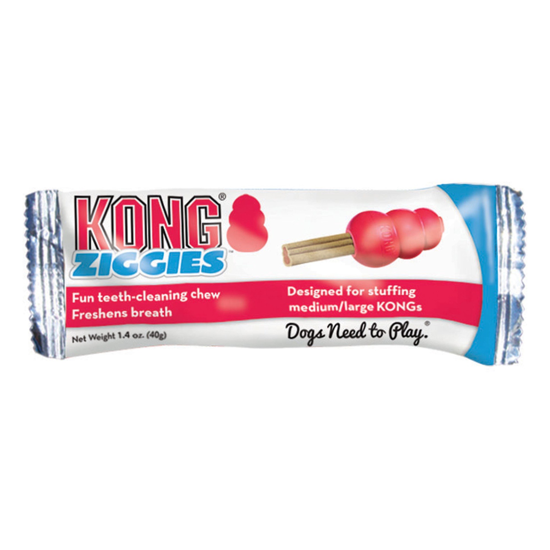 KONG Ziggies are a healthy treat that are specially formulated for adult dogs. This deliciously chewy treat is safe and highly digestible. When stuffed in a KONG toy, it lasts twice as long as the lea…