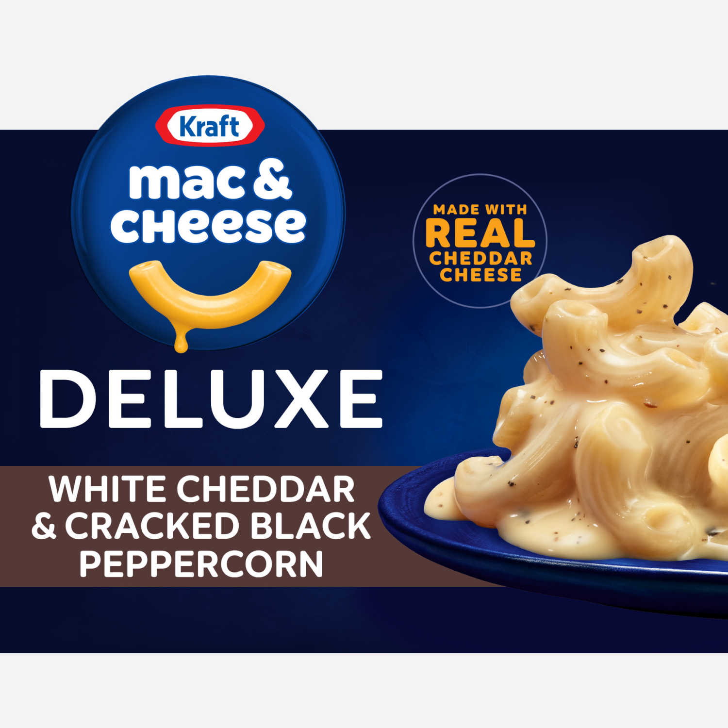 Help yourself to a bowl of comfort with Kraft Deluxe White Cheddar & Cracked Black Peppercorn Macaroni & Cheese Dinner. Rich and creamy, our dinner is made with ridge macaroni and real white cheddar c…