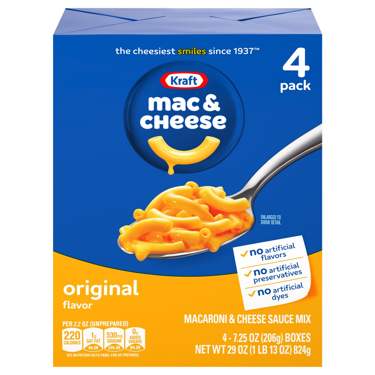 Kraft Mac and Cheese, 4 Boxes, for Easy Dinner or Dinner Sides, Original Flavor, No Artificial Flavors, Preservatives or Dyes, 7.25 oz