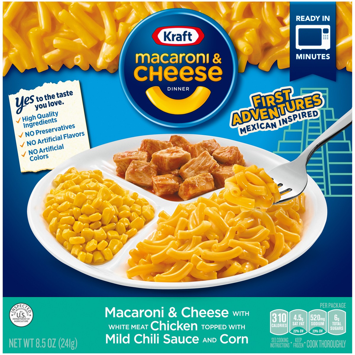 Macaroni & cheese with white meat chicken topped with mild chili sauce and corn. No artificial flavors. Per Package: 310 calories; 4.5 g sat fat (23% DV); 500 mg sodium (22% DV); 6 g sugars. Ready in …