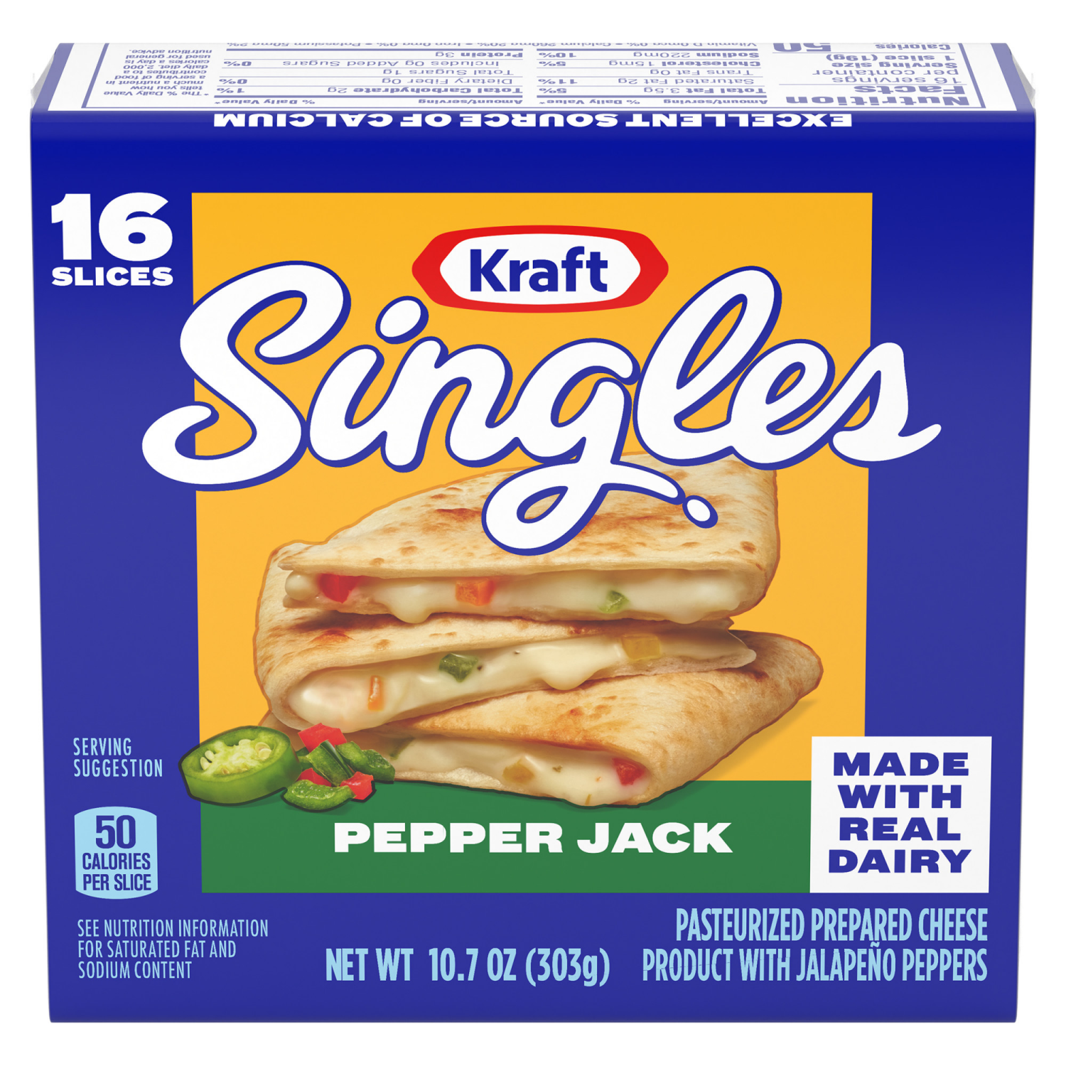 Delicious any way you square it, Kraft Singles Pepper Jack Cheese Slices deliver the classic taste and irresistible melt that take your favorite foods to the next level. Made with real dairy and no ar…