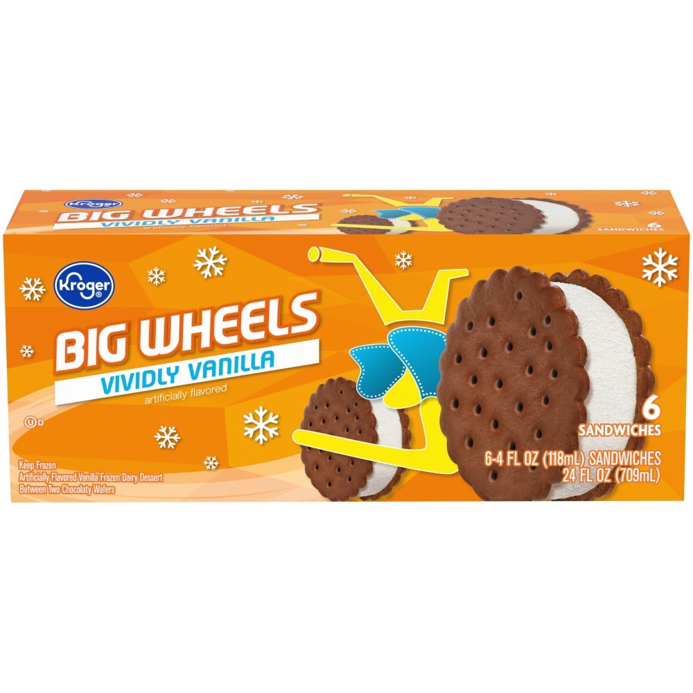 Kroger® Big Wheels Vanilla Frozen Dairy Dessert Sandwiches bring joy to the table! They're a delightful creamy, cool treat packed with irresistible vanilla taste between two delicious chocolaty wafers…