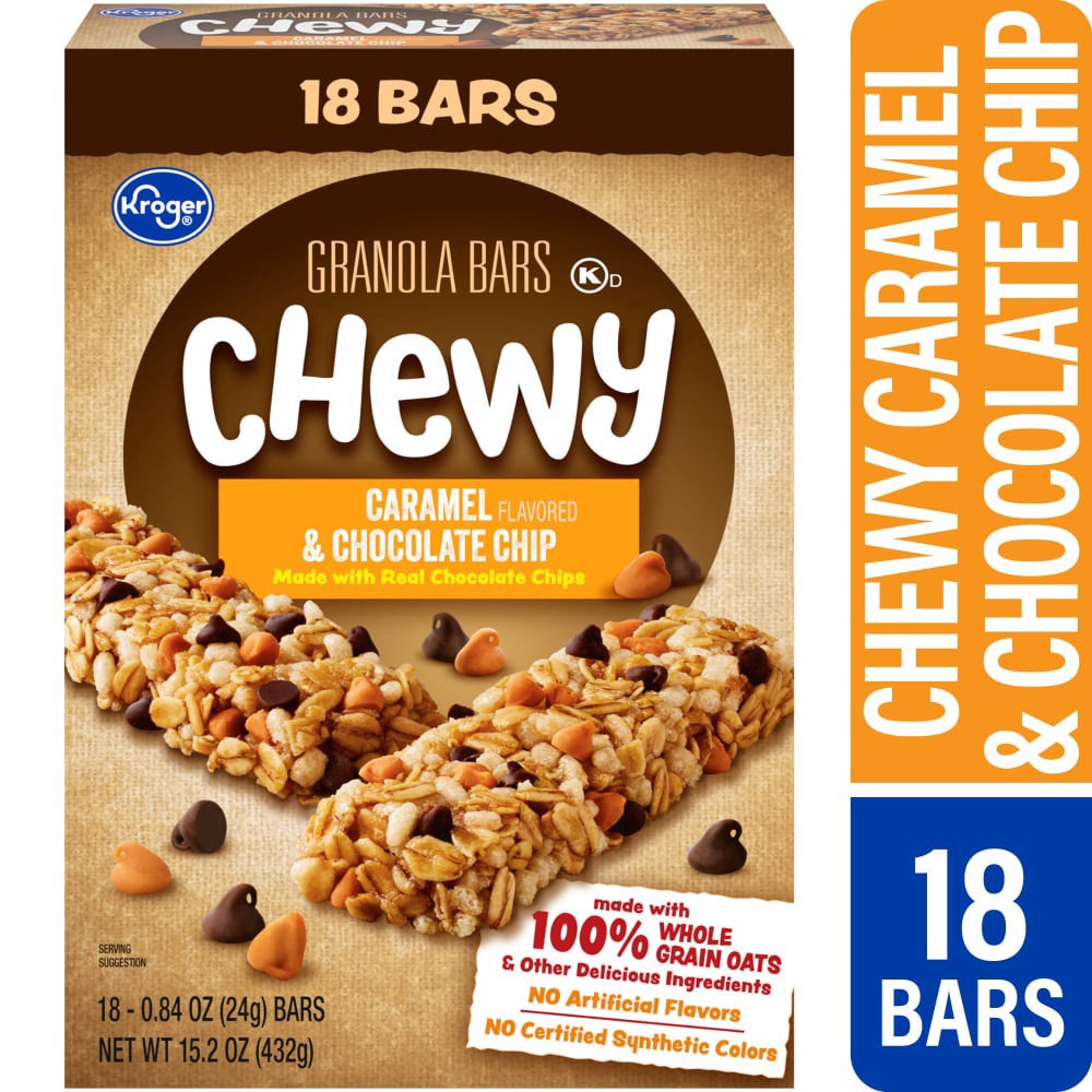 Kroger® Caramel & Chocolate Chip Chewy Granola Bars make snacking deliciously easy! With caramel flavored chips and semisweet real chocolate chips for a tasty treat. Made with 100% whole grains with n…