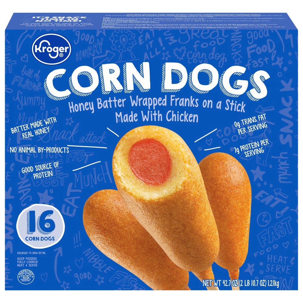 Kroger® Corn Dogs bring snack time fun! Coated in batter made with real honey, each corn dog packs 7g protein per delight. No complicated meals here – just heat, serve, and savor. Enjoy these succulen…