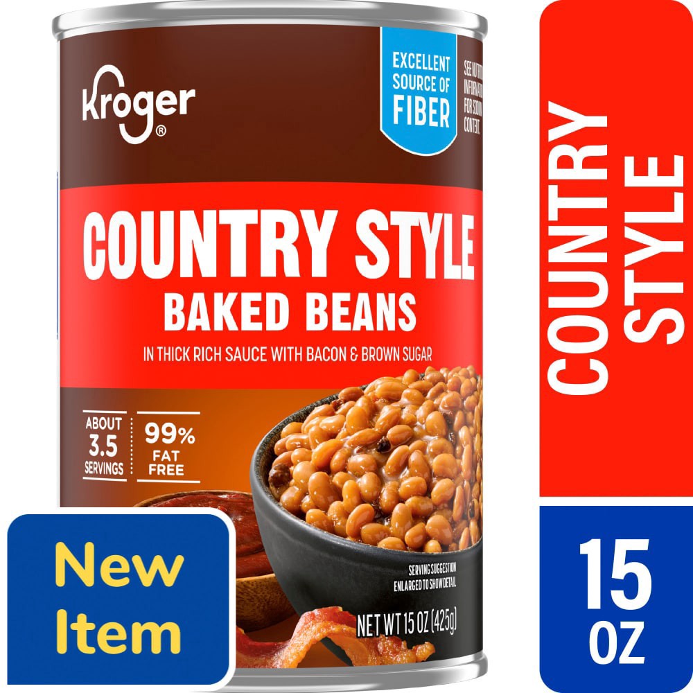 Kroger® Country Style Baked Beans are a powerhouse of flavor! These baked beans are cooked in thick rich sauce with bacon and brown sugar for a tempting mix. An excellent source of fiber and 99% fat f…