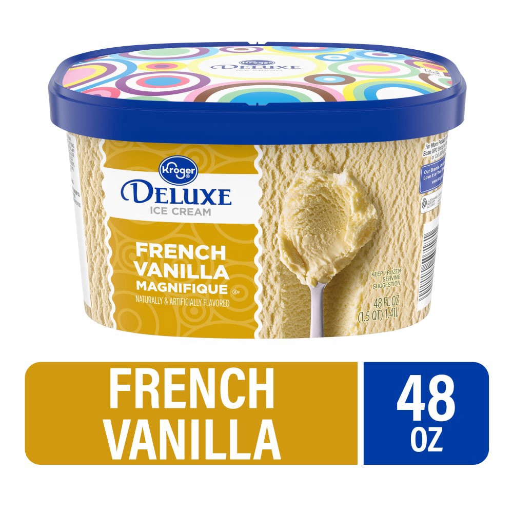 Kroger® Deluxe French Vanilla Magnifique Ice Cream Tub churns rich cream and sweet sugar into a delight! Whip up milkshakes, create sundaes, or simply enjoy scoops straight from the tub. Keep taste bu…
