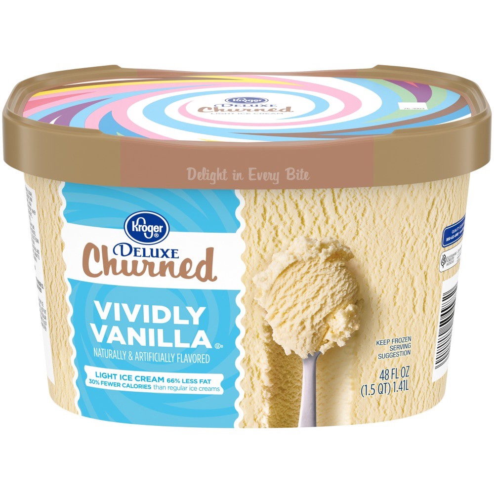 Kroger® Deluxe Churned Vividly Vanilla Light Ice Cream Tub bursts with vanilla flavor! With 66% less fat and 30% fewer calories that regular ice creams, it's a smart treat any time. With a blend of mi…