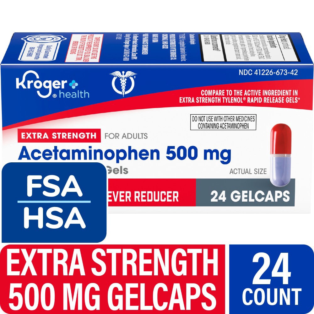 Kroger® Extra Strength Pain Reliever and Fever Reducer Acetaminophen Rapid Release Gelcaps 500mg help temporarily give relief to adult aches and pains. With the active ingredient of acetaminophen, the…