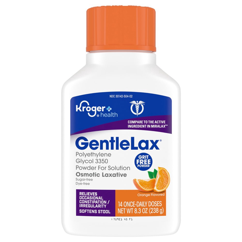 Compare to the active ingredient in MiraLAX. Kroger Polyethylene Glycol 3350 Powder for Solution, Orange Flavor, is a laxative used to relieve occasional constipation. An osmotic laxative, it works by…