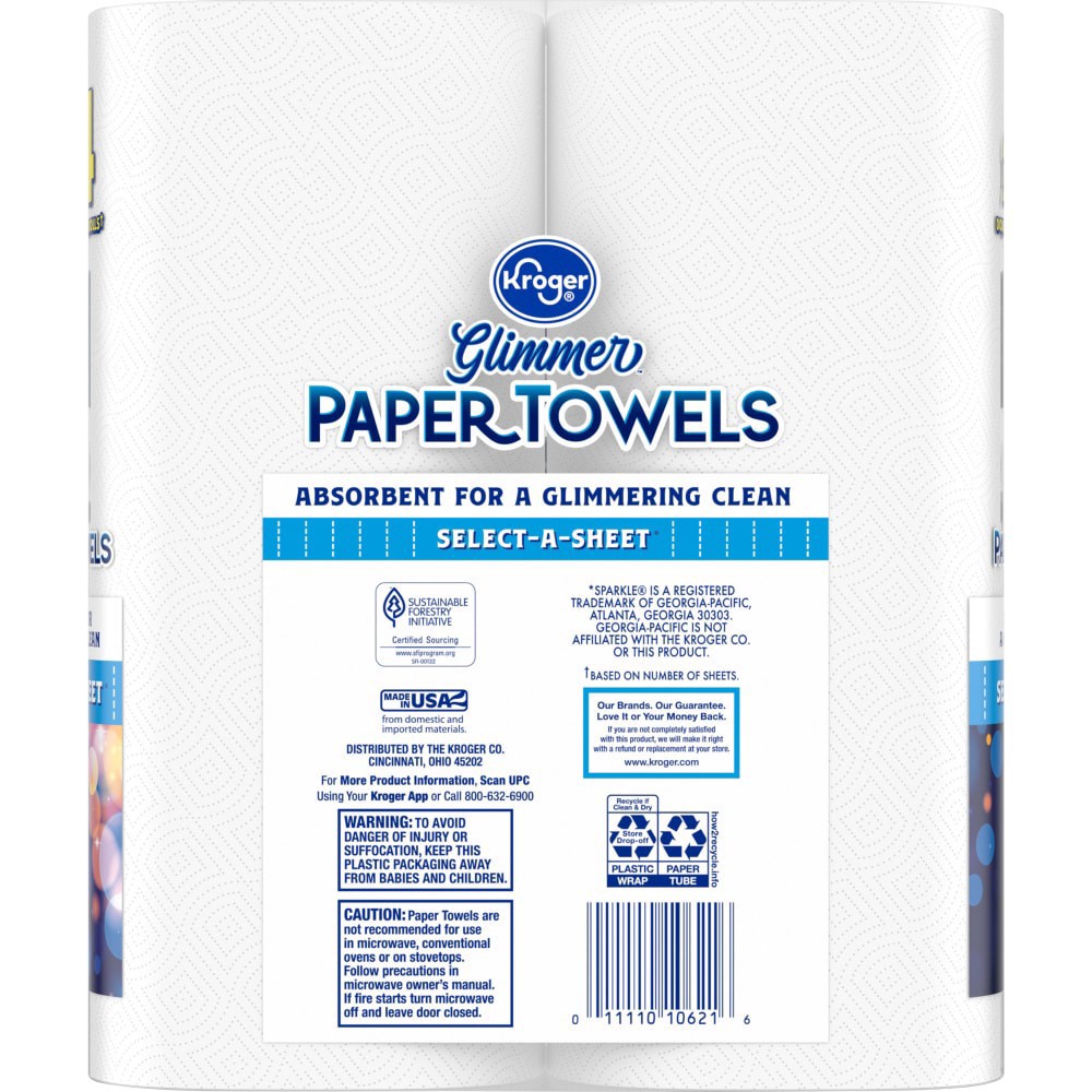 Kroger® Glimmer Double Roll Paper Towels two-ply sheets are engineered to quickly and effectively soak up spills, leaving surfaces clean, dry, and glimmering! Whether it's a small mess or a larger spi…